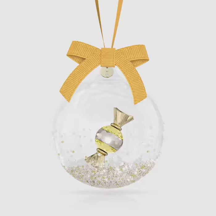 Encapsulating the sweetness and joy of the season, this delightful ball ornament features Swarovski’s signature yellow colour and 230 light-catching facets. The wondrous glass design is embellished with around 2,200 small crystal rocks on the outside, as if the piece has been dipped in coloured sugar. On the inside, a yellow candy with a luxurious gold-tone metal wrapper is suspended in mid-air. Hanging from a yellow grosgrain ribbon tied in a bow, this ball ornament also includes a champagne gold-tone metal tag with the year “2024” and a single chaton. Decoration object. Not a toy. Not suitable for children under 15.
