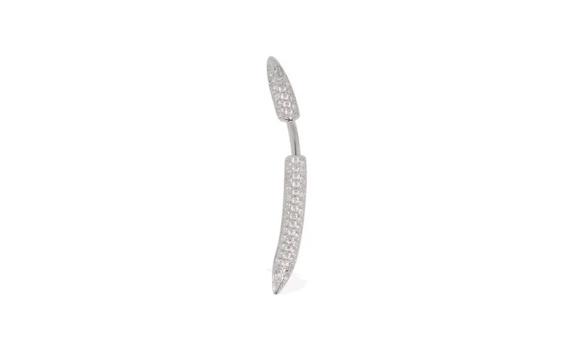 The APM Earring, Asymmetrical consists of a post that is positioned on the front of the ear and the other as a clasp behind the ear. The earring is sold individually to cultivate the asymmetrical side.