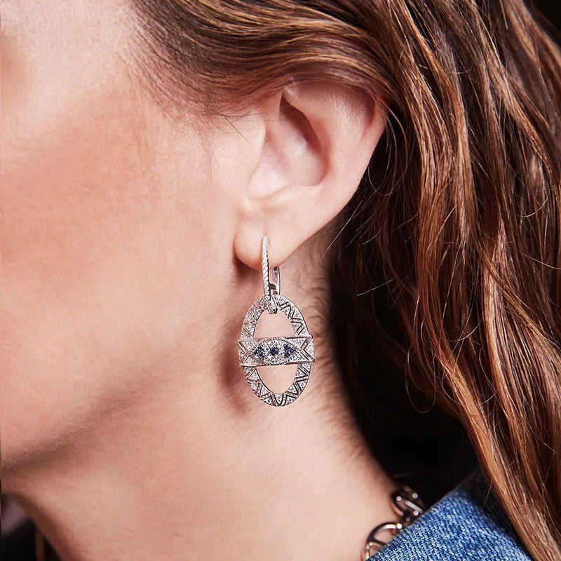 These chain-link earrings are handcrafted from sterling silver and micropaved with white zirconia stones and blue nanos.