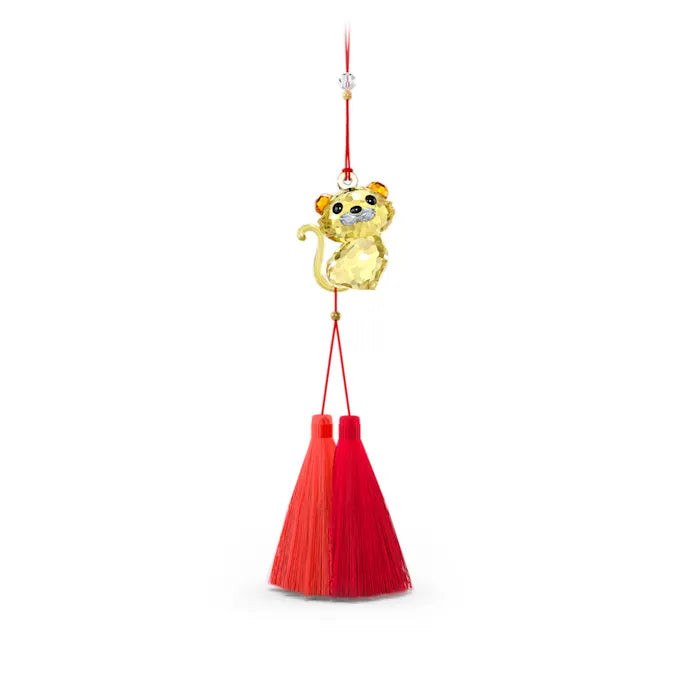 Celebrate 2022 with this cute tiger ornament, which perfectly embodies the charming and friendly character that those born in the Year of the Tiger are said to have. Very playful and fun, it sparkles with 396 facets of yellow, brown and clear crystal. The dual red and orange tassels and thread, gold-tone metal beads and black print add more auspicious colour and intricate detail to the overall design. It is a perfect gift for Chinese New Year or any other occasion, especially when combined with the matching Tiger figurine. Decoration object. Not a toy. Not suitable for children under 15.