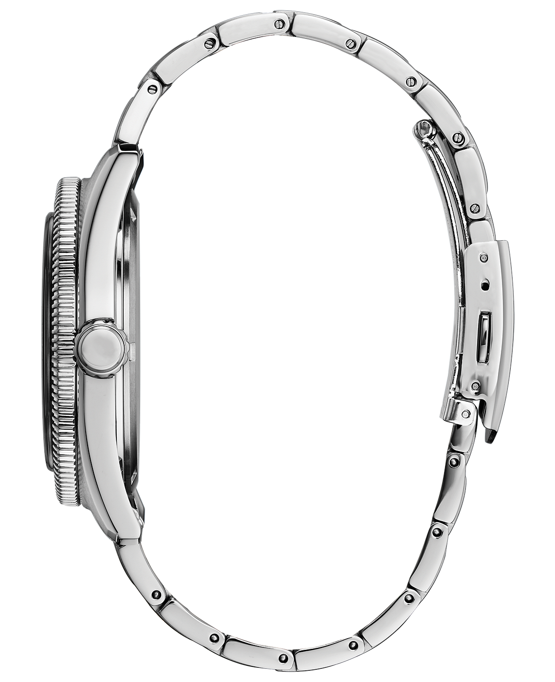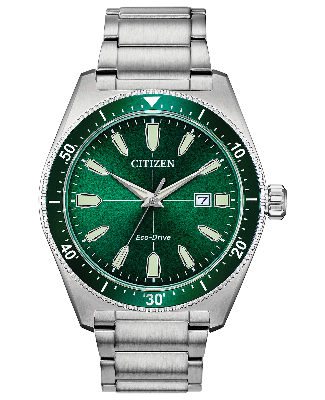 Nothing says classic better than a vintage throwback, and the redesigned Citizen Vintage Brycen Sport timepiece is just that, with distinguished features sure to stand out on your wrist. This stylish watch in a stainless steel case with pine green dial and bezel, stainless steel bracelet and date. Featuring our Eco-Drive technology – powered by light, any light. Never needs a battery. Caliber number J810.