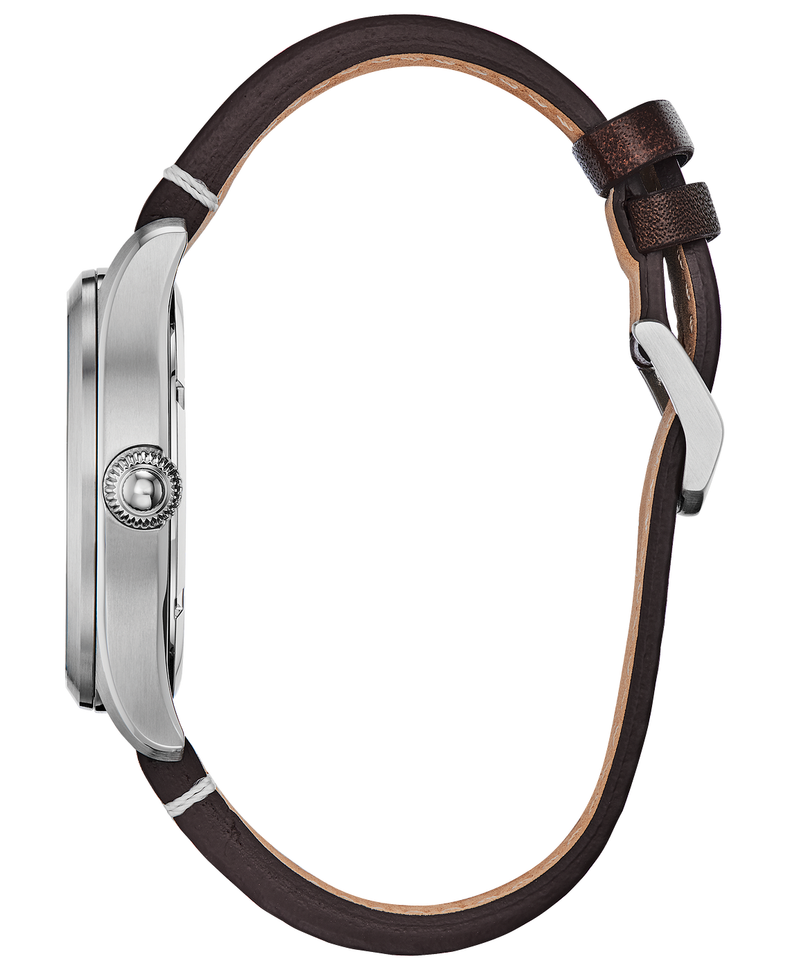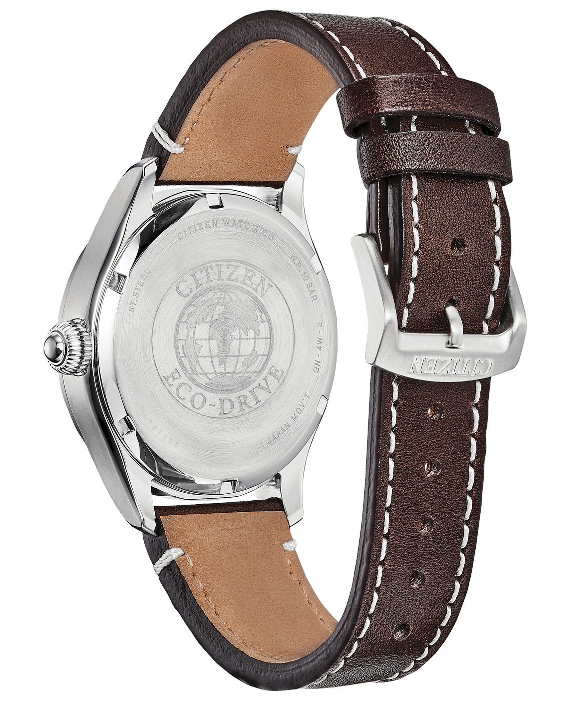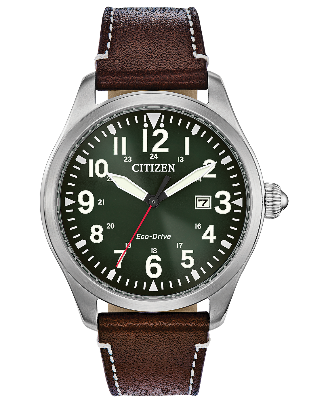 The CITIZEN Garrison Military watch, polished and comfortable, is the perfect addition to your watch collection. Featured here in a stainless steel case, dark brown strap with evergreen dial and date. Featuring our Eco-Drive technology – powered by light, any light. Never needs a battery. Caliber number E111.