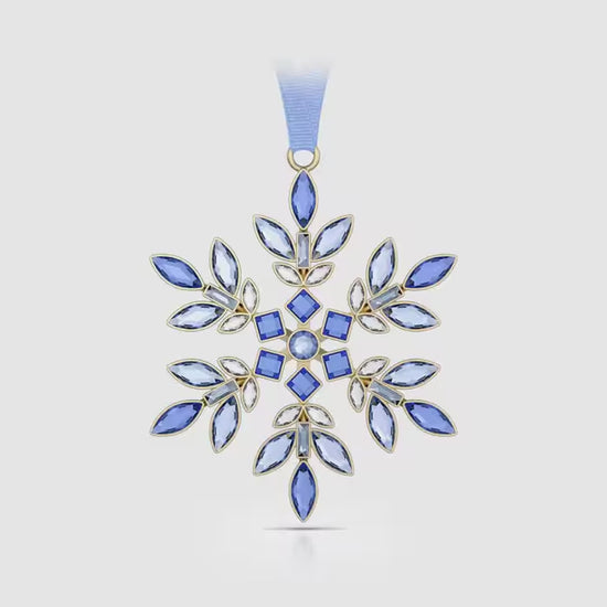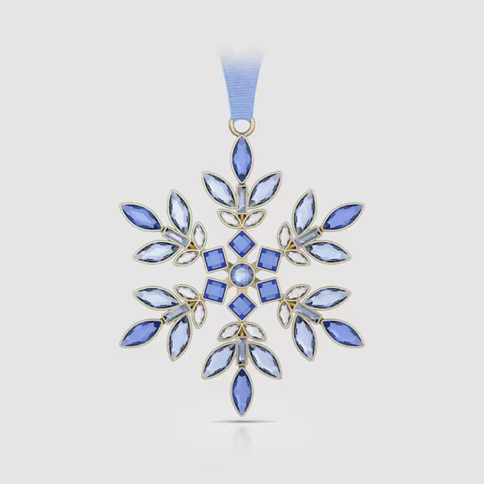 Inspired by the vibrant Gema family, this collection of radiant snowflake ornaments is presented in Swarovski brand colours with a nod to the holiday season. This blue piece is formed from 86 individual crystals in a variety of cuts and shades, applied on both sides using jewellery stone setting techniques. The design is suspended from a blue grosgrain ribbon and is completed with a glossy gold-tone finish. Collect all four of the Gema snowflake ornaments to create a joyful multicoloured display in your home. Decoration object. Not a toy. Not suitable for children under 15.