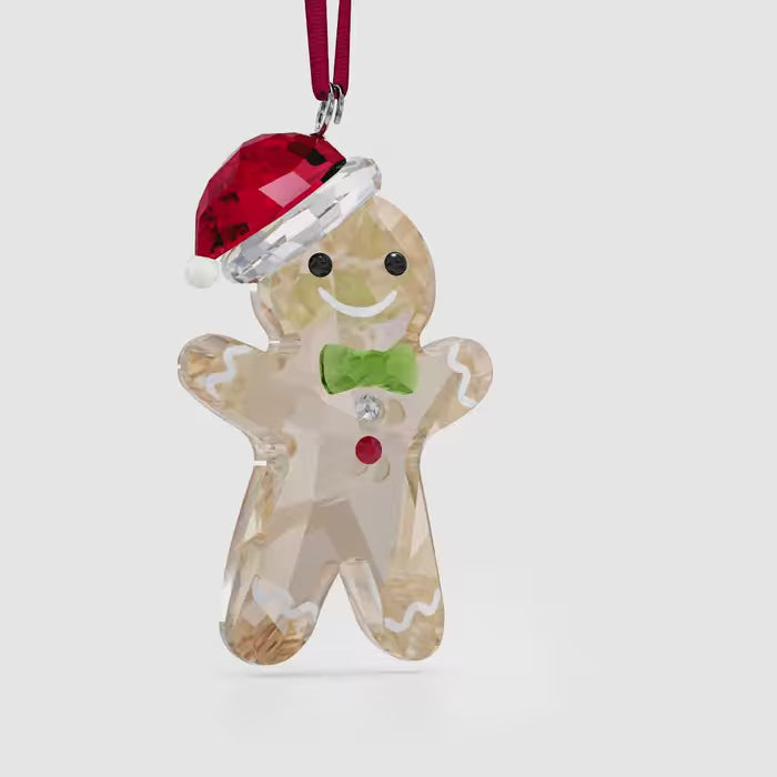 This jolly gingerbread man ornament is a fun addition to your seasonal curation. It shines with 195 facets of gold-toned crystal with white print detailing and green, red, black, and clear crystal accents. A cute and charming character to trim your tree or hang in your window on its red grosgrain rayon ribbon, it will awaken childhood memories of festive baking. A wonderful gift, especially when combined with the other pieces in the nostalgic Holiday Cheers collection. Decoration object. Not a toy. Not suitable for children under 15.