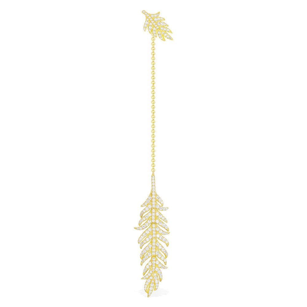 Opt for an asymmetric style with this stunning dropping earring in feather shape. Embellished with white stones, it will add the perfect edgy touch that you were looking for. Wear it with a APM stud or hoop for a unique combination.