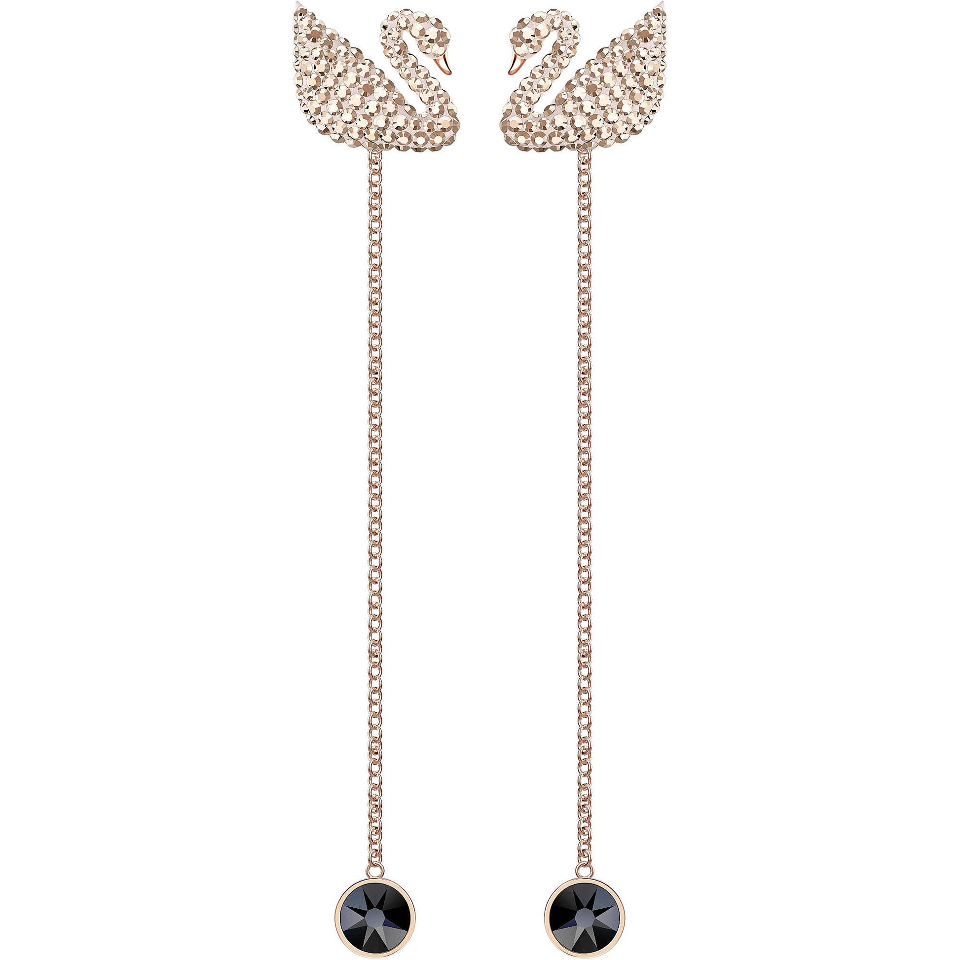 Ensure you make an impression with these modern and versatile long-length pierced earrings. Our iconic swan motif takes center stage, shining with golden crystal Pointiage®. Wear as studs, or add the dangling rose gold-plated chain elements, punctuated with black crystals, for fashion-forward refinement.