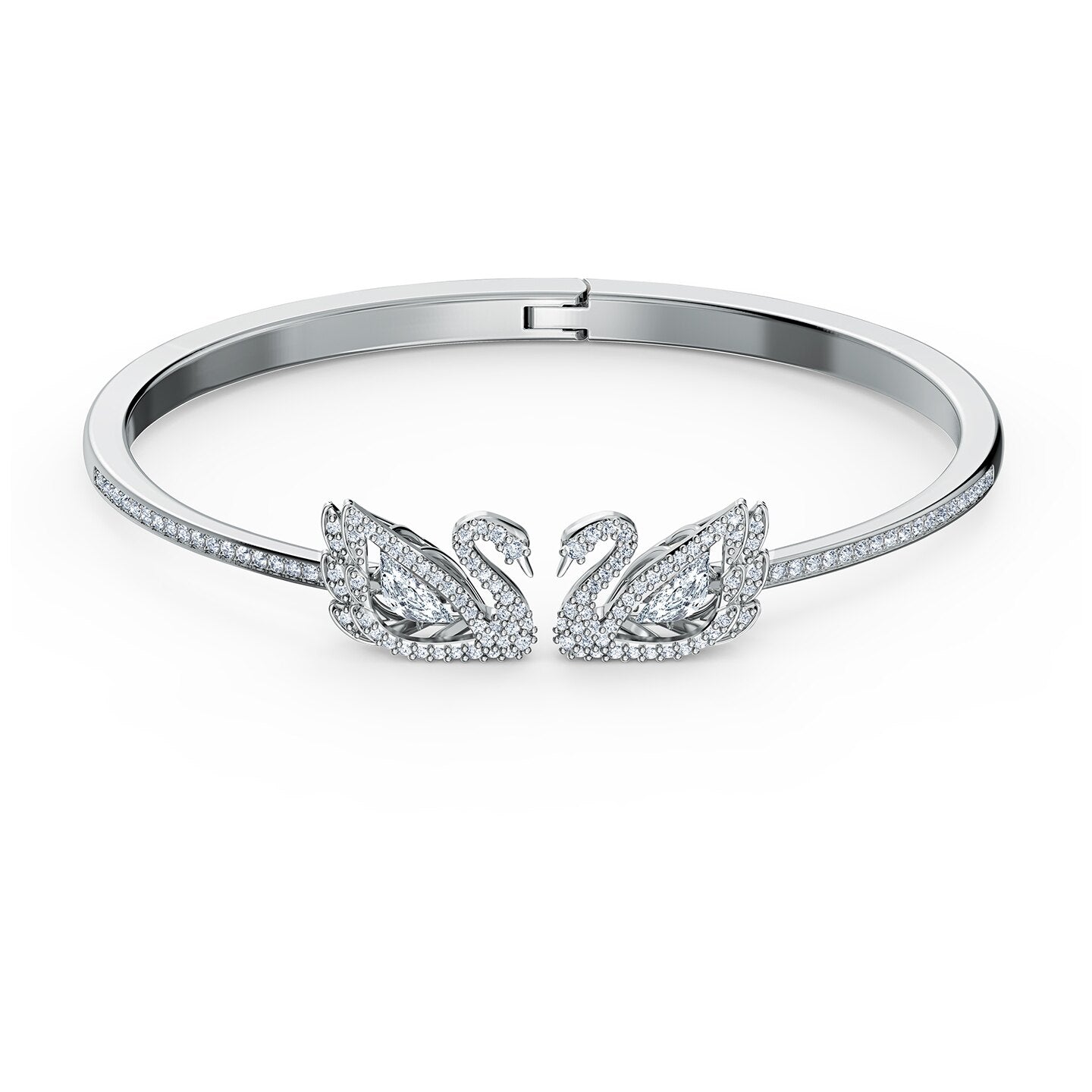 Like a swan on a lake: This delicate bracelet by Swarovski combines timeless elegance with modern design. With its numerous fine details, like double layers of feathers, this graceful pair of swans with shimmering stones and rhodium plating reflects and refracts incoming light for unique Swarovski sparkle. The bangle evokes images of a glittering lake surface. A glamorous gift for special occasions.
