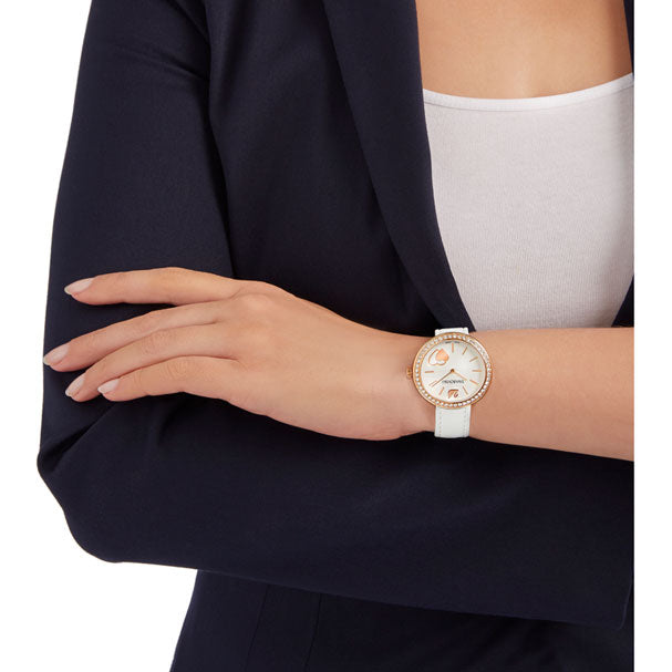 Romantic and stylish, this timepiece is an ideal gift for Valentine’s Day. Specifications: case - stainless steel with a rose-gold tone coating and 48 clear crystals on the bezel, 34mm; dial - white silver-toned sunray pattern with index markers, a rose-gold colored heart design and the Swan logo at 12 o’clock; strap - white leather strap, 19 cm; movement - Swiss quartz.
