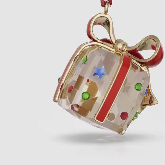 This playful gift-wrapped ornament is an ideal addition to any festive tree. Suspended from a red grosgrain ribbon, the parcel design is crafted with Swarovski’s Golden Shadow effect and 426 facets, while also featuring decorative crystals in red, green and blue. The ribbon is neatly formed from champagne gold-tone metal with a red lacquer. Add this ornament to your own seasonal display or gift it to someone special for a touch of holiday joy. Decoration object. Not a toy. Not suitable for children under 15.