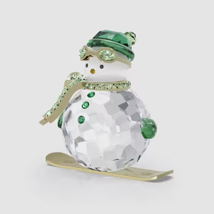 Head to the slopes this holiday season with this delightful snowman. The charming design is crafted with 711 facets, green accents and glossy champagne gold-tone metal. Cheery details include the snowman’s hat, the snowboard, the goggles and the scarf inlaid with flatback crystals. A playful addition to your winter wonderland. Decoration object. Not a toy. Not suitable for children under 15.