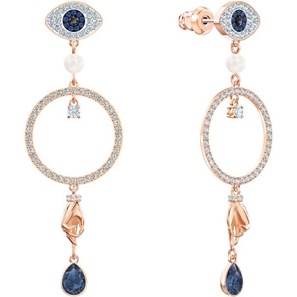 Swarovski once again champions bold and innovative looks with this pair of front-facing pierced hoop earrings. A delicate pavé evil eye symbol features at the top of the design, before romantic white Crystal Pearls, pavé hoops, 3D-shaped hands, and pear-shaped blue crystals come into play. A cool rose-gold tone plated look for elegant styling with bohemian edge.