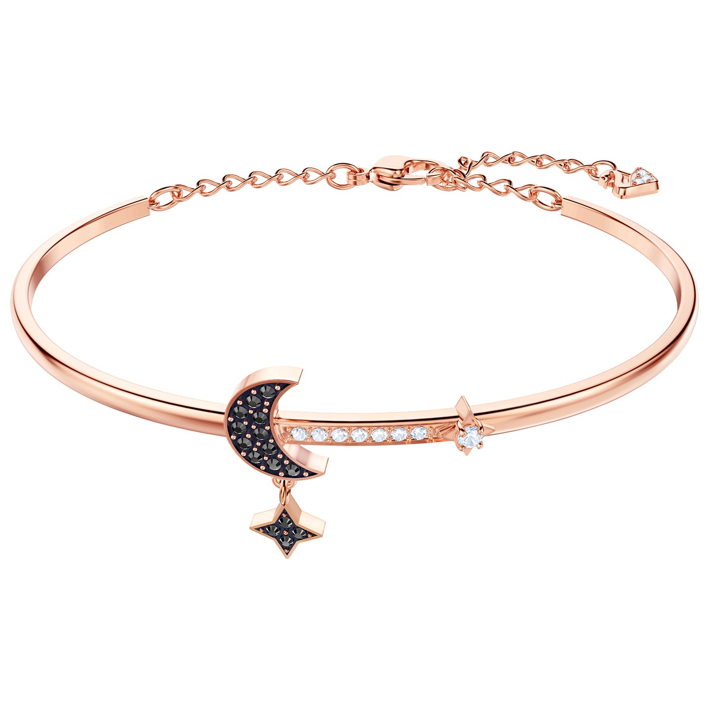 Drawing inspiration from the night sky, this stunning rose gold-plated bangle will become a permanent fixture in your jewelry box. Featuring a black pavé moon and star motif and delicate clear crystal detailing, it is a cool and romantic look. With an adjustable lobster clasp, it will sit gracefully on your wrist, day and night.