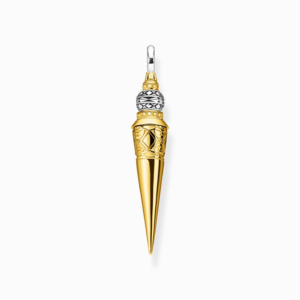 The shape of this pendant symbolises the world axis. It binds negative energies and is derived from the traditional "Phurpa" symbol of the Himalaya region. In this artistic and at the same time graphically inspired interpretation of THOMAS SABO, filigree ornaments decorate the iconic piece of jewellery, their details contrasting the brilliance of the precious metals gold and silver.