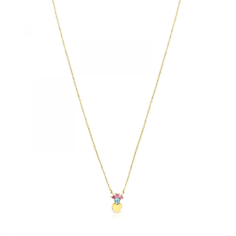 TOUS Real Sisy heart necklace in 18kt yellow gold with 0.2-cm rubies and 0.3-cm blue topaz. Size: 0.56 cm. Length: 45 cm.