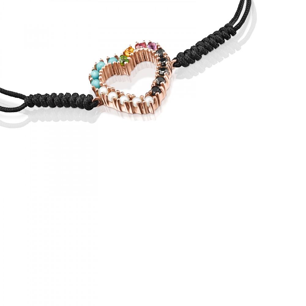 TOUS San Valentín heart bracelet in rose gold vermeil with pearls, turquoise, tsavorite, orange sapphire, ruby, amethyst, spinels and black cord. Size: 1.6 cm. Length: 21.5 cm. (Vermeil: Sterling silver covered with 18kt rose gold plating.)
