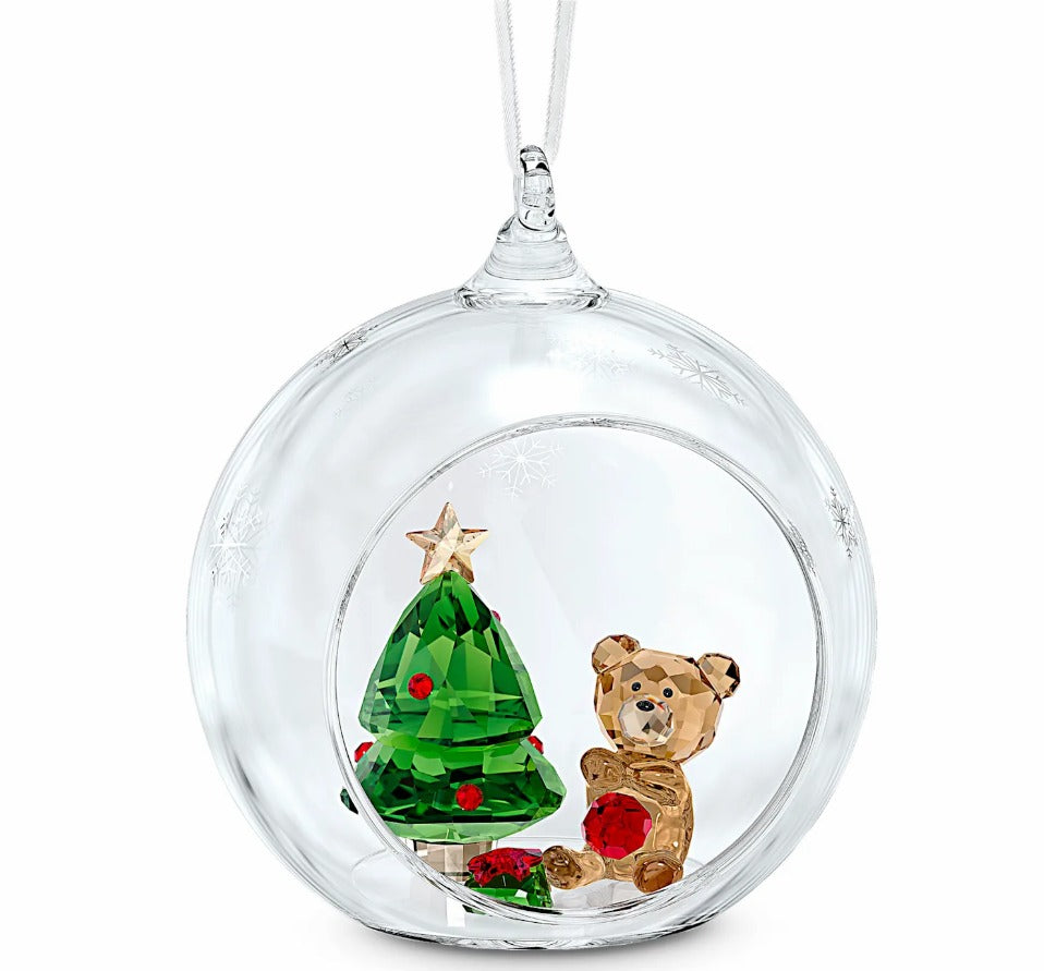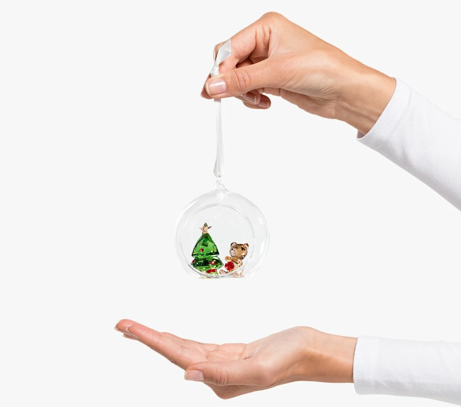 This Swarovski ball ornament has captured childhood memories in loving detail. Inside a hand-crafted, mouth-blown open glass ball, a sparkling crystal teddy bear sits next to a festive tree, with the scene featuring crystals in traditional green and red. The sparkle of the 621 crystal facets is further enhanced by the white ribbon and the delicate white snowflakes printed on the outside of the ball, perfecting the festive scene in a winter wonderland. A charming ornament that will add an emotional touch to your range of decorations, and a perfect gift. Decoration object. Not a toy. Not suitable for children under 15.