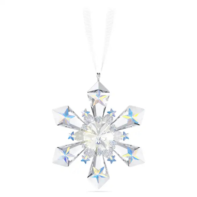 A dazzling star lies at the heart of any holiday décor. This shimmering piece offers a fresh interpretation of the classic motif with 288 radiant facets and silver-tone metal accents. Twelve flatback stars in large and small sizes surround the centre, each produced with Swarovski’s mesmerising Aurora Borealis effect. Suspended from a white grosgrain ribbon, this ornament is a wondrous piece that will bring joy throughout the season. Decoration object. Not a toy. Not suitable for children under 15.