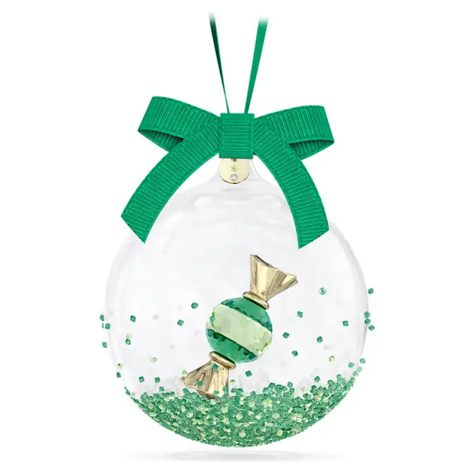 Encapsulating the sweetness and joy of the season, this delightful ball ornament features Swarovski’s signature green colour and 230 light-catching facets. The wondrous glass design is embellished with around 2,200 small crystal rocks on the outside, as if the piece has been dipped in coloured sugar. On the inside, a green candy with a luxurious gold-tone metal wrapper is suspended in mid-air. Hanging from a green grosgrain ribbon tied in a bow, this ball ornament also includes a champagne gold-tone metal tag with the year “2024” and a single chaton. Decoration object. Not a toy. Not suitable for children under 15.