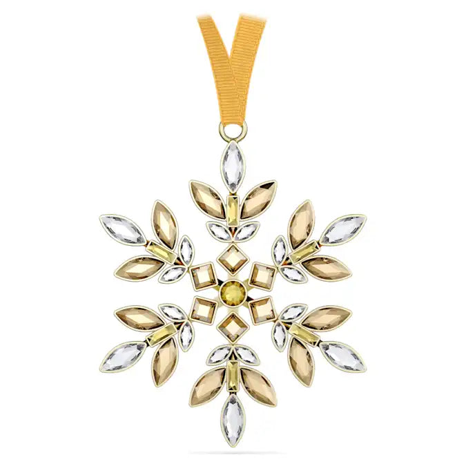 Inspired by the vibrant Gema family, this collection of radiant snowflake ornaments is presented in Swarovski brand colours with a nod to the holiday season. This yellow piece is formed from 86 individual crystals in a variety of cuts and shades, applied on both sides using jewellery stone setting techniques. The design is suspended from a yellow grosgrain ribbon and is completed with a glossy gold-tone finish. Collect all four of the Gema snowflake ornaments to create a joyful multicoloured display in your home. Decoration object. Not a toy. Not suitable for children under 15.