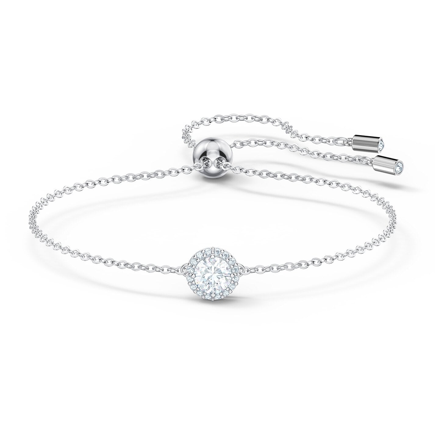 Add the timeless Swarovski sparkle to your everyday outfits with this beautiful bracelet. It consists of a simple, fine chain adorned with a beautifully cut white stone bounded by a line of white pavé. The size of the bracelet can be adjusted easily with a sliding closure. The classic look is perfect to supplement casual styles and makes this bracelet a beautiful gift giving idea.