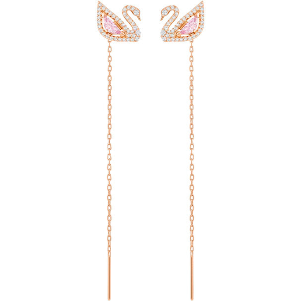 Enjoy multiple looks with this dazzling pair of versatile long-length pierced earrings. The iconic swan motif shines with a full-cut crystal body in cool millennial pink and crisp clear pavé lines. Wear as simple studs, or attach one, or both, of the delicate rose gold-plated chains for more statement style. A dainty design that will undoubtedly add cool and romantic style to your everyday collection. Matching items are available.