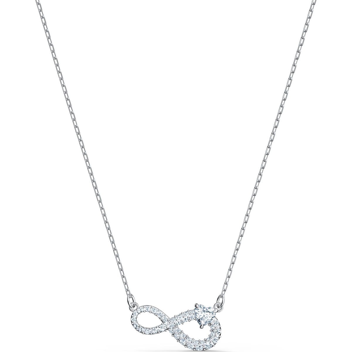 This Swarovski necklace showcases an infinity symbol on a rhodium-plated chain and is the perfect expression of eternal love. A single white stone in the shape of a heart is set onto the infinity element, adding a romantic touch to the design. The perfect gift for a loved one.