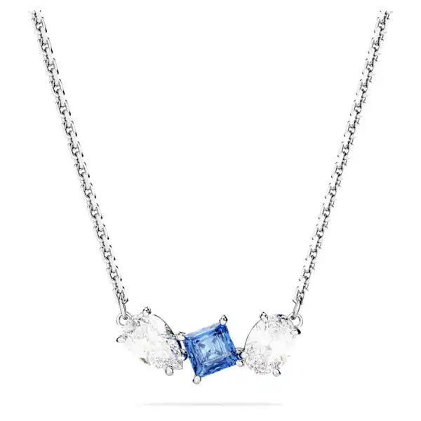 This elegant Mesmera pendant delivers exquisite refinement through its bold mix of cuts and colour. Worn on a delicate chain, the rhodium plated design features a trio of prong-set Swarovski Zirconia in varying shapes with a radiant blue central stone. A wondrous gift that will accentuate any style.