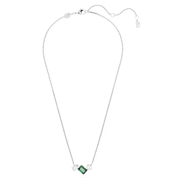 This elegant Mesmera pendant delivers exquisite refinement through its bold mix of cuts and colour. Worn on a delicate chain, the rhodium plated design features a trio of prong-set Swarovski Zirconia in varying shapes with a radiant central stone in hypnotic green. A wondrous gift that will accentuate any style.