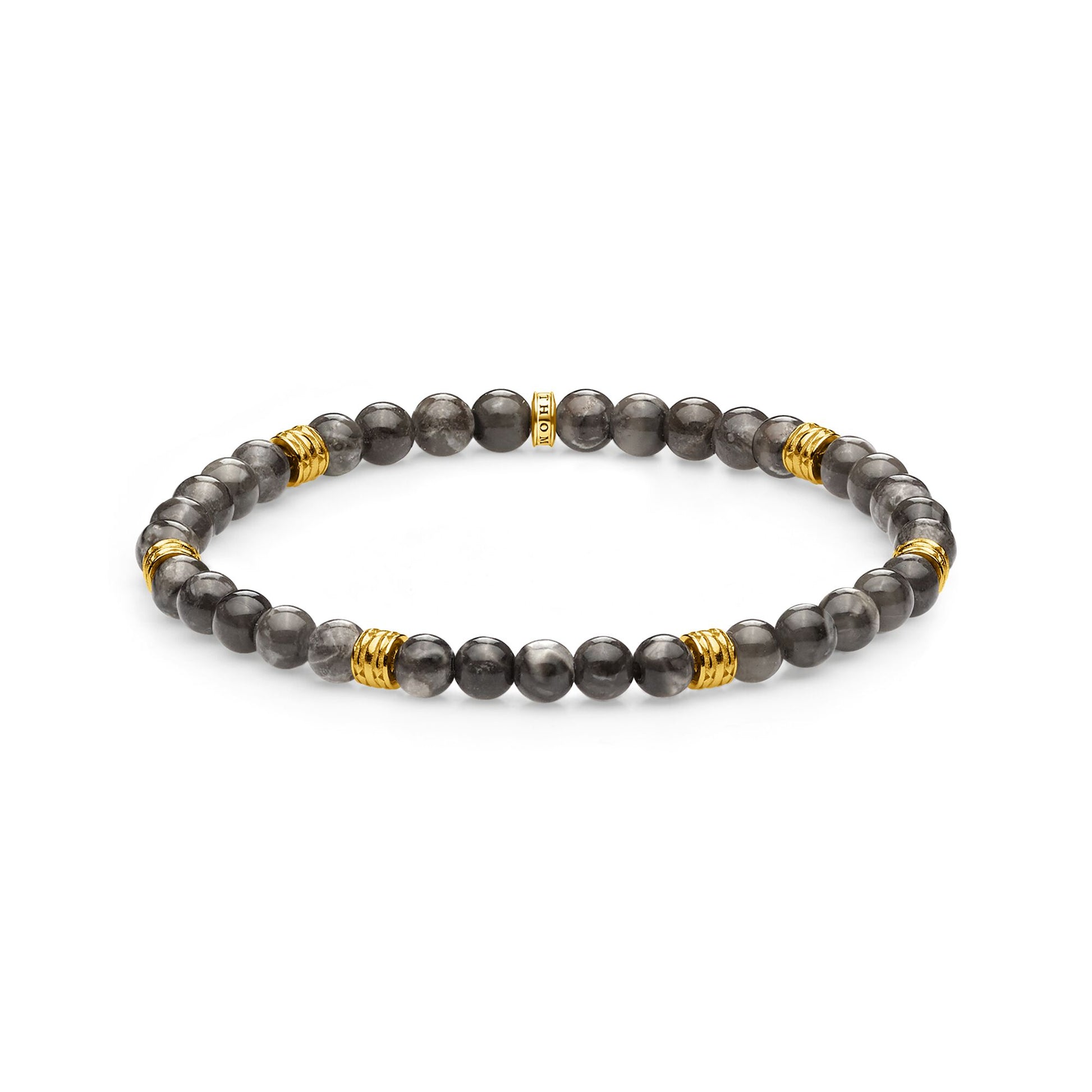 This lucky charm bracelet is adorned with Beads of grey marble whose natural texture makes each Bead unique. The highlights are silver Beads with 18k yellow gold plating that have been elaborately designed by hand.