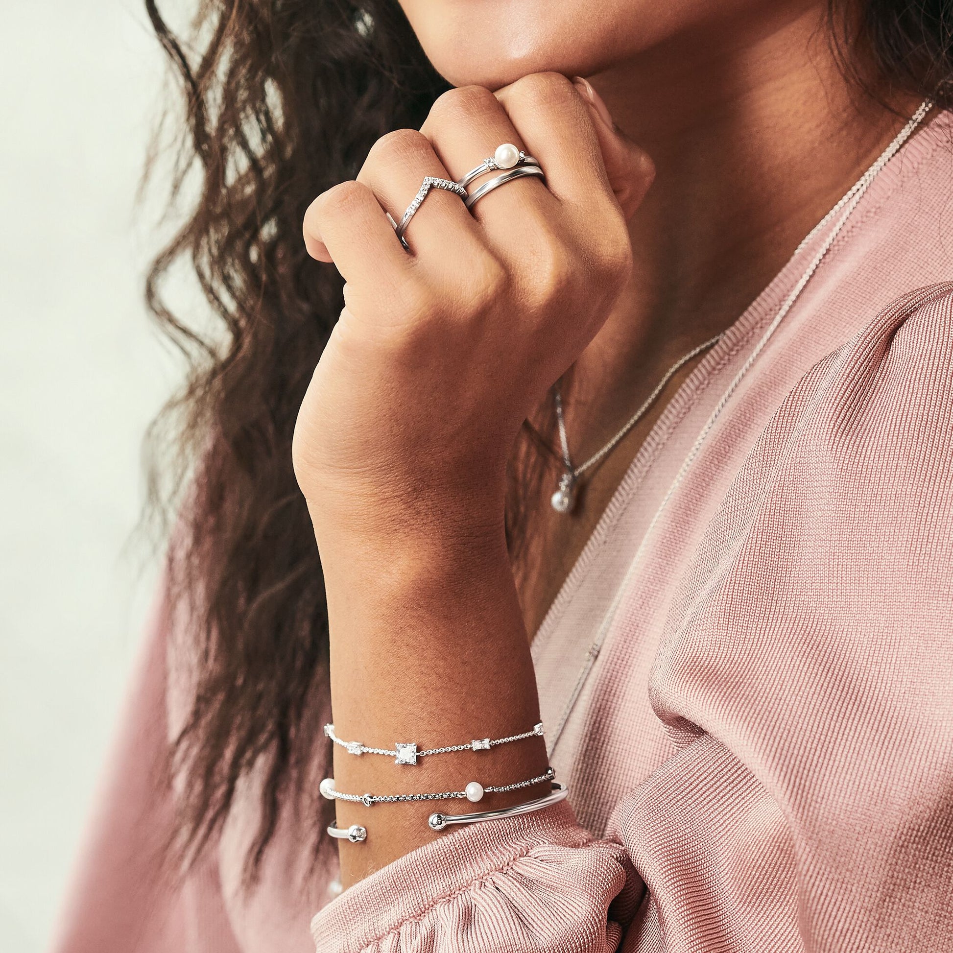 Go outside and shine: The bracelet is decorated with sparkling zirconia stones. They are set in claw settings, which are open on the side and faceted in a square and baguette-shaped princess cut. By every movement, they ignite an especially intensive firework. The filigree bracelet made of 925 Sterling silver is designed in high quality and has an extension chain. With its help, the length of 16 to 19 cm can be individually adjusted to the wrist. The delicate piece of jewellery in a timeless and geometric style can easily be combined with any outfit.