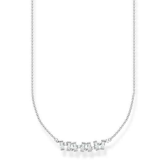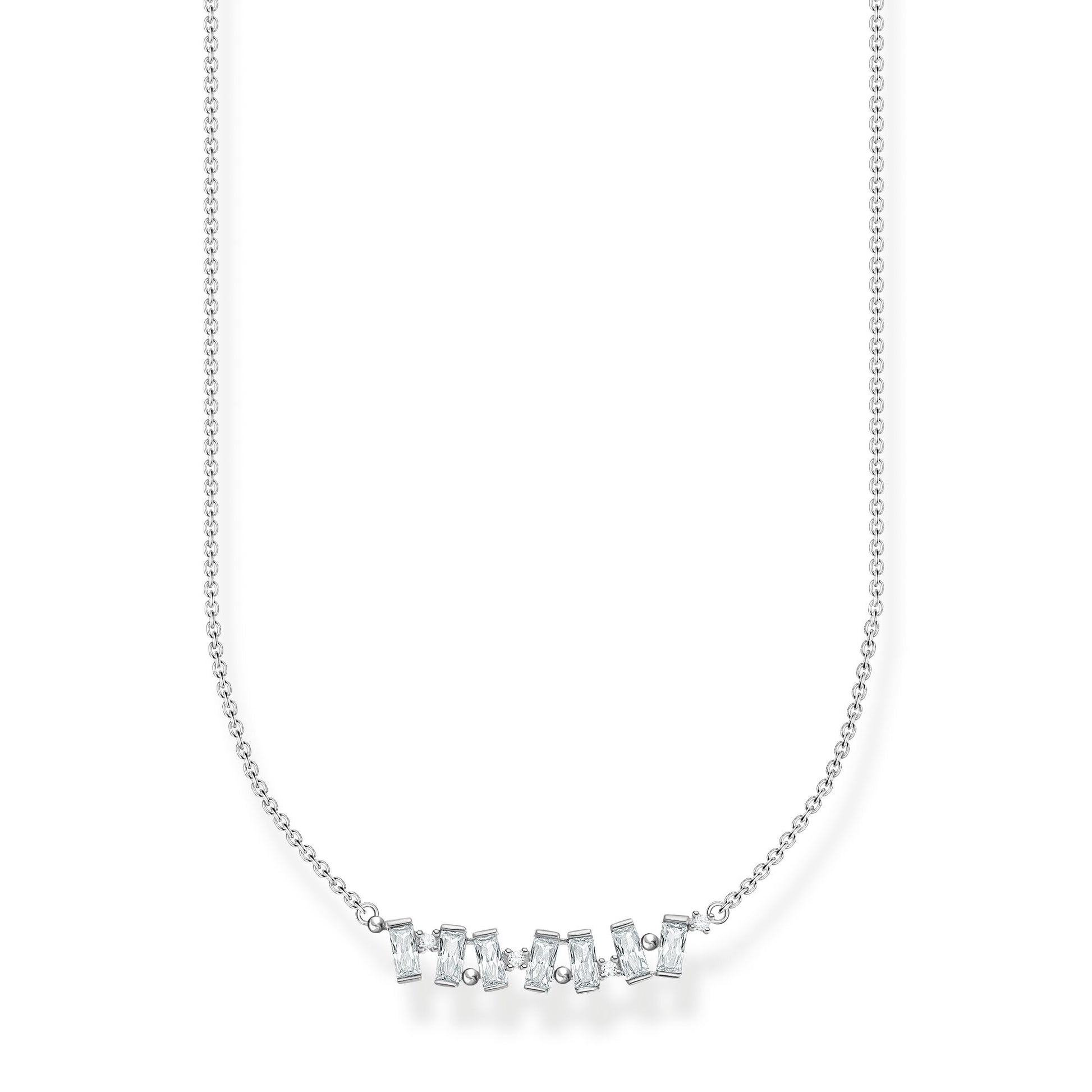 The sterling silver Thomas Sabo necklace white stones, silver KE2095-051-14-L45V necklace sparkles with several beautiful baguette-cut synthetic zirconia, and the chain is adjustable to 38-45 cm. The Thomas Sabo jewellery comes in the original manufacturer's box.
